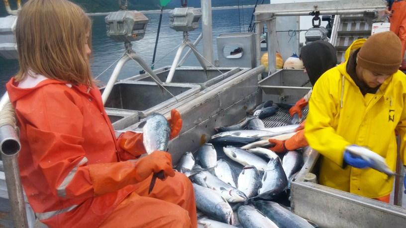 Bailey, my 8-year-old mentor, is showing me the ropes and teaching me how to sort salmon. Her job is taking temperatures. This has to be done at least 3 times during the pumping to ensure the fish have been kept appropriately cold in the holds. Cold temps mean better quality fish. The holding tanks are held at temps slightly above 32 degrees.