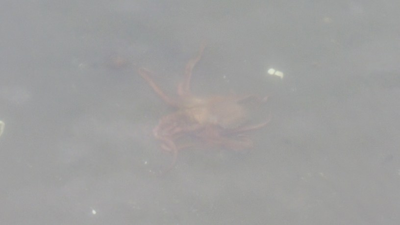 WE SAW A GIANT PACIFIC OCTOPUS TODAY! It was SO COOL! I might say my life is complete. Maybe you have seen a giant octopus before – but for me this elusive creature I’ve only witnessed in captivity. We were walking on the pier. Someone spied a big lion jelly in the shallow waters. This led to checking out the starfish…. and then I noticed this big shape working its way in to the shallow water…. it was an octopus! We watched this magnificent creature for at least 20 minutes. It scuttled along the sand looking for a meal. The water was maybe 4 feet deep and we were a good 20 feet above it on the dock so the picture is quite faint. It was a bright red/orange color. and it moved alternating between spreading out some tentacles to being all bunched up with tentacles bent. They can hustle!