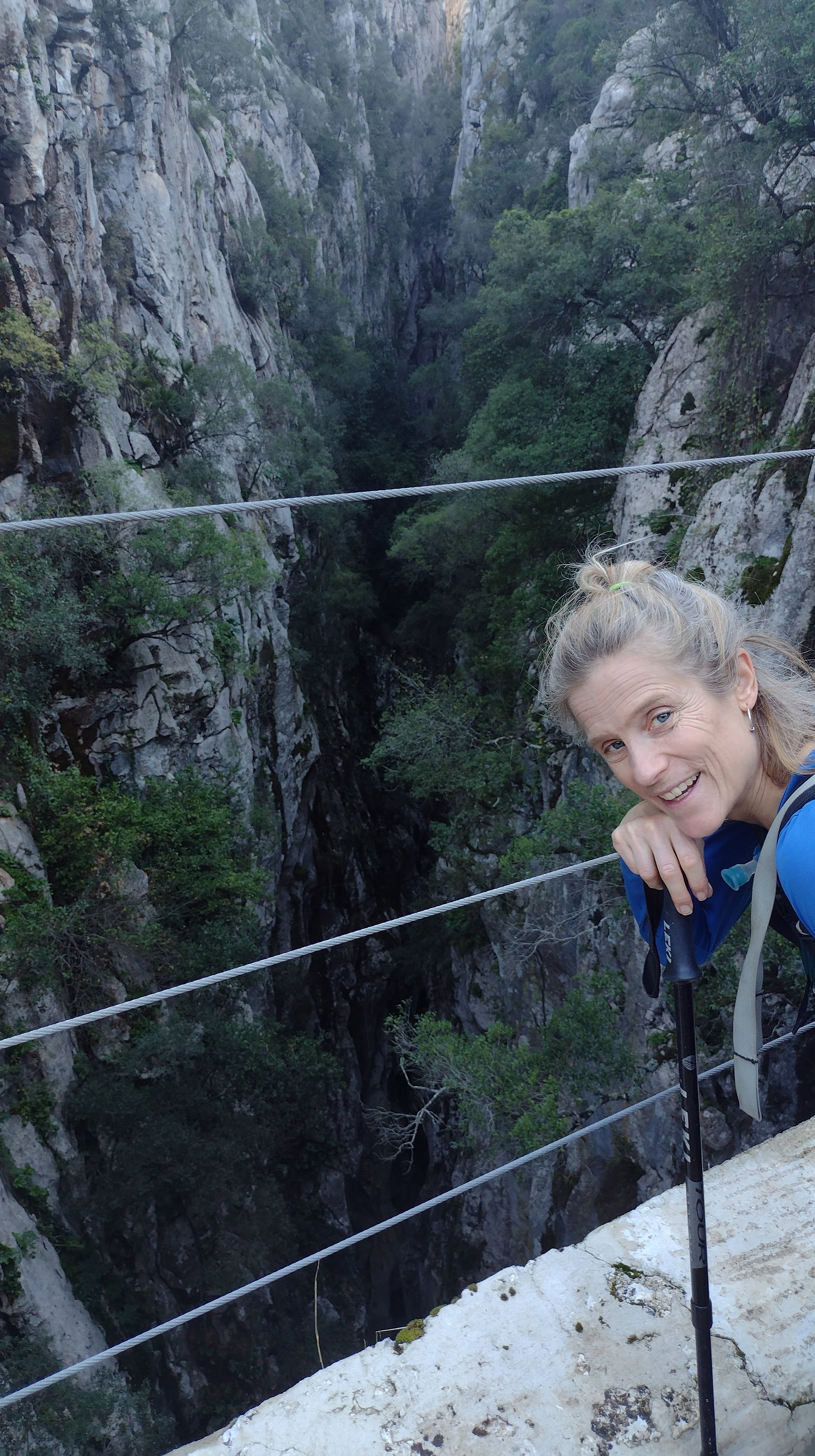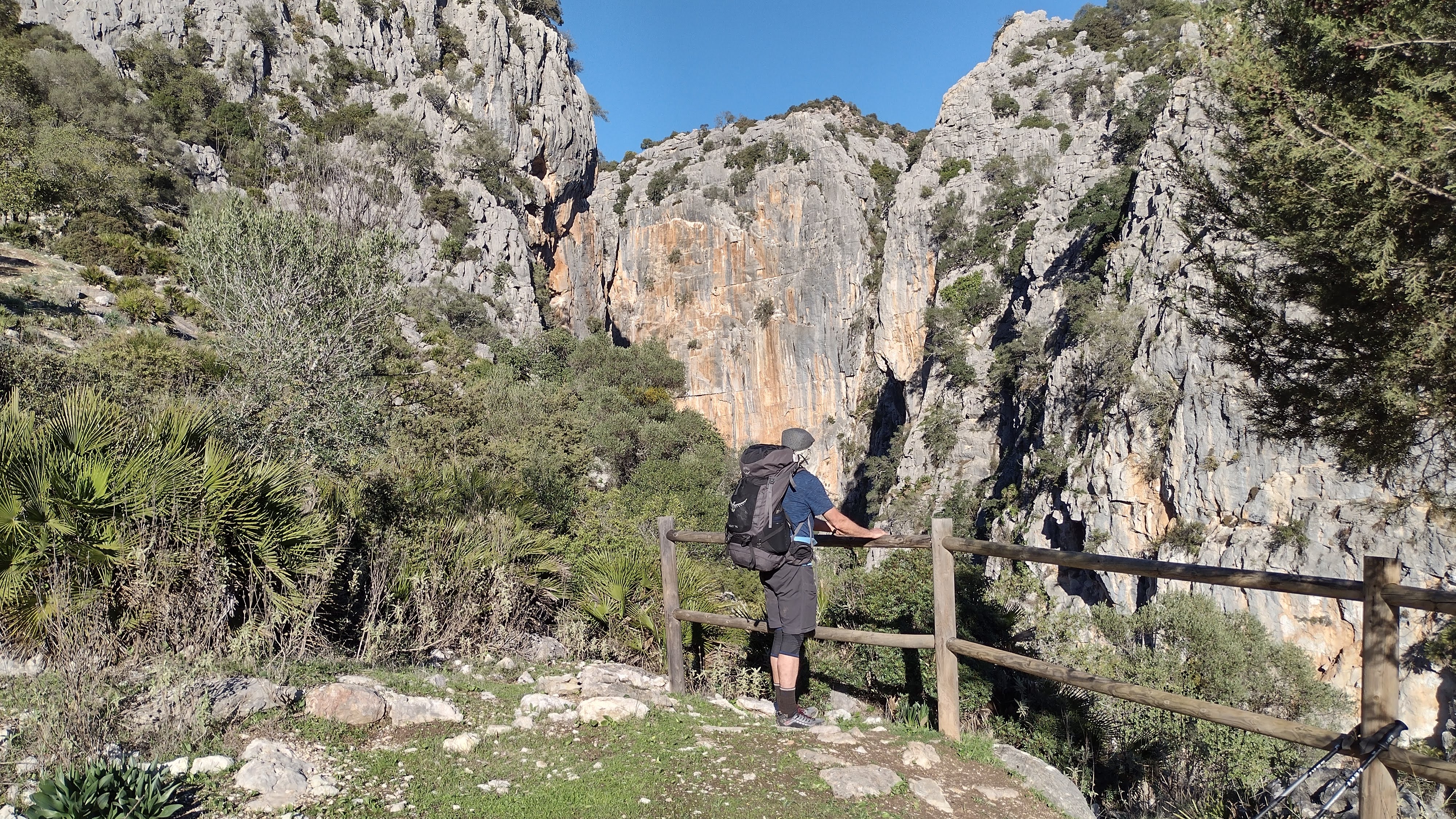 The gradiose display of nature occurs after climbing to the high point. The valley unfolds below with the Rio Guadiaro snaking through it. Sandstove cliffs form the canyon walls and majestic backdrop. The water was swift and loud, carving swirls and grooves into the valley walls.