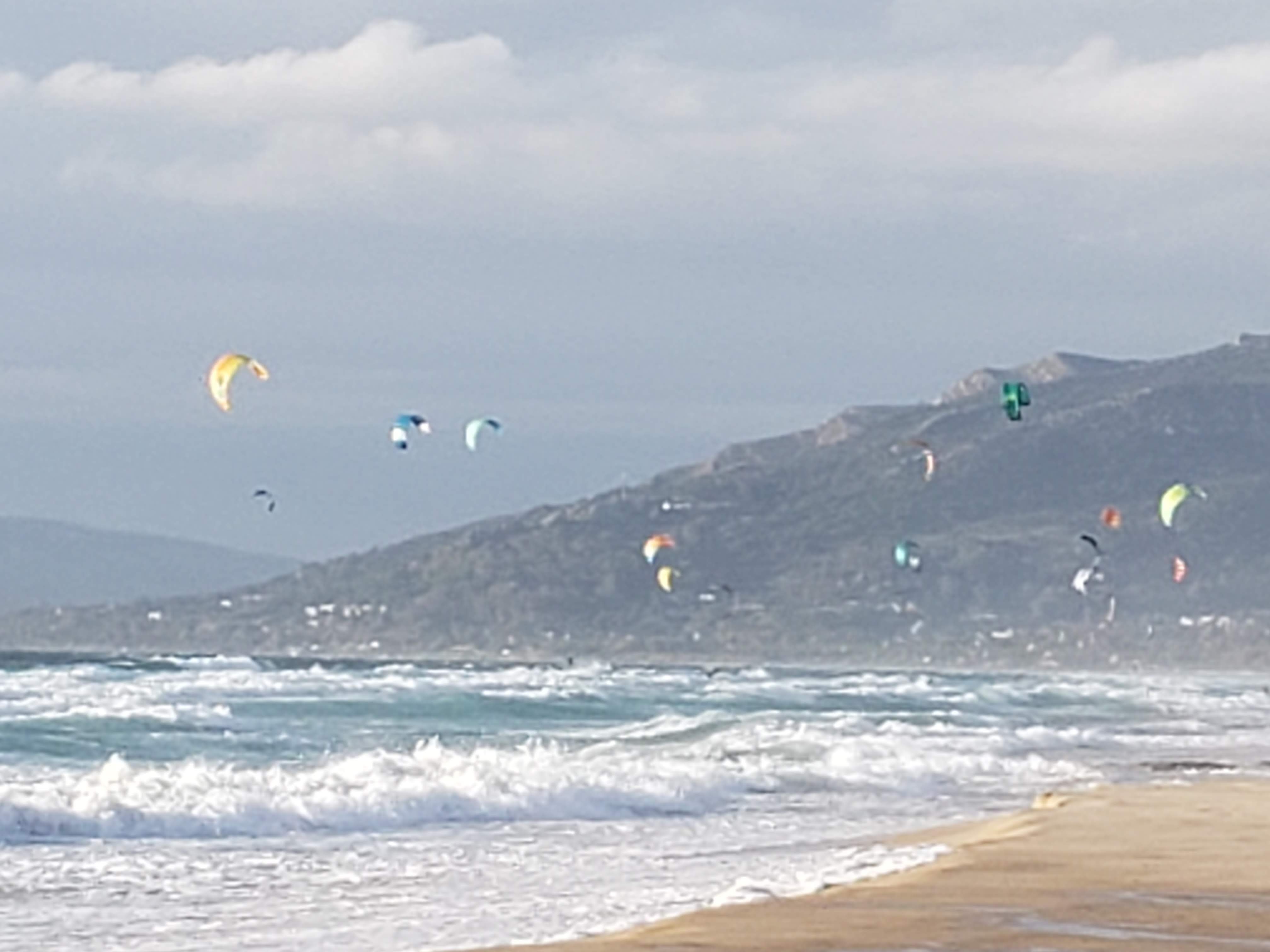 I’m leaning into the wind as grains of sand blast my face. We made it! Rolled into town, literally, on the M-550 intercity bus and were greeted by the winds that make Tarifa one of the foremost kitesurfing destinations in the world. Hundreds of kitesurfers in their church paying homage to the wind by riding wildly across unruly waves, thier kites parasols dotting the sky. It’s good to be here, it smells like salt and sea. The wind is roaring, waves are crashing, Mike and I have to shout to hear each other on the beach.