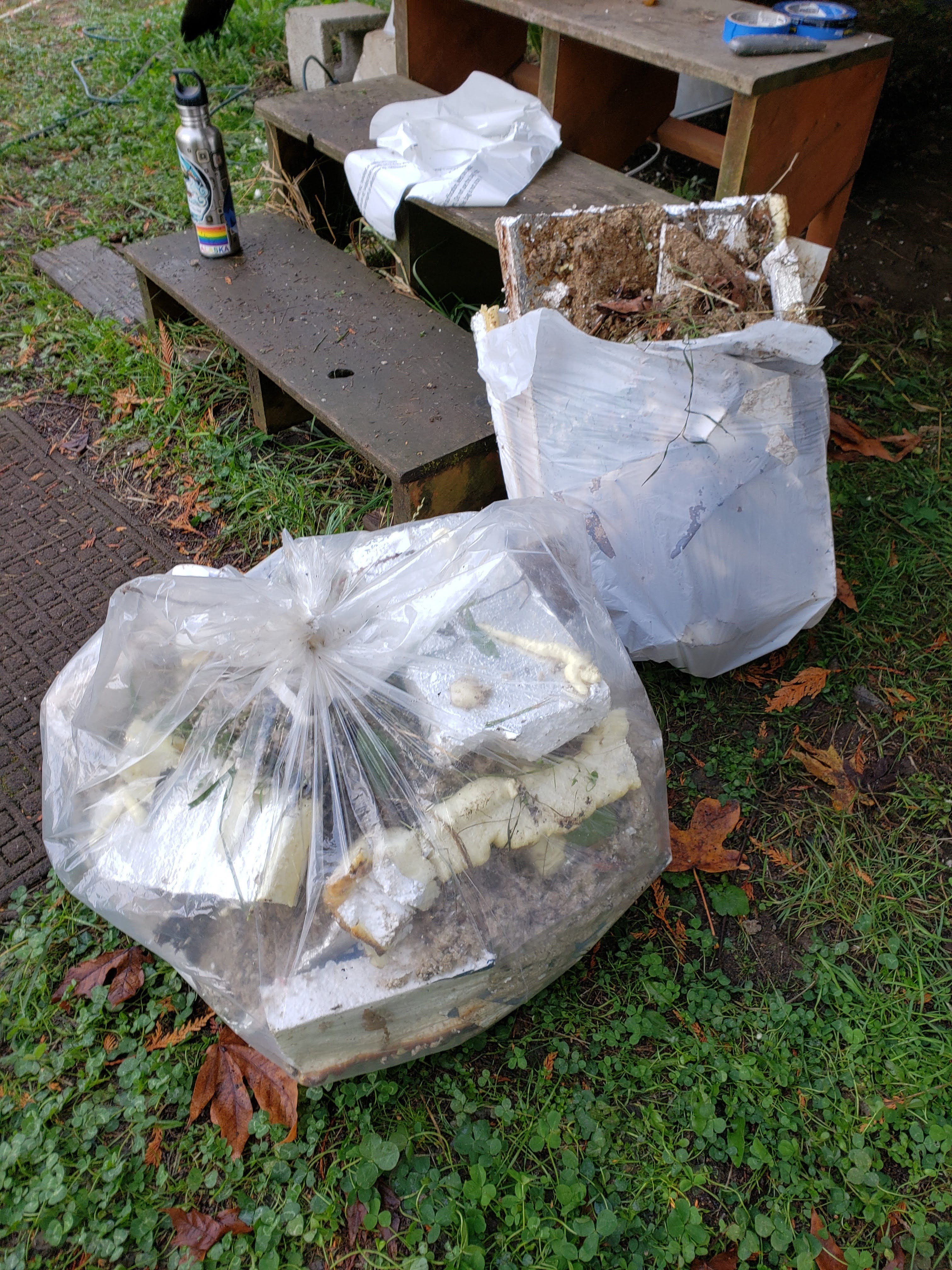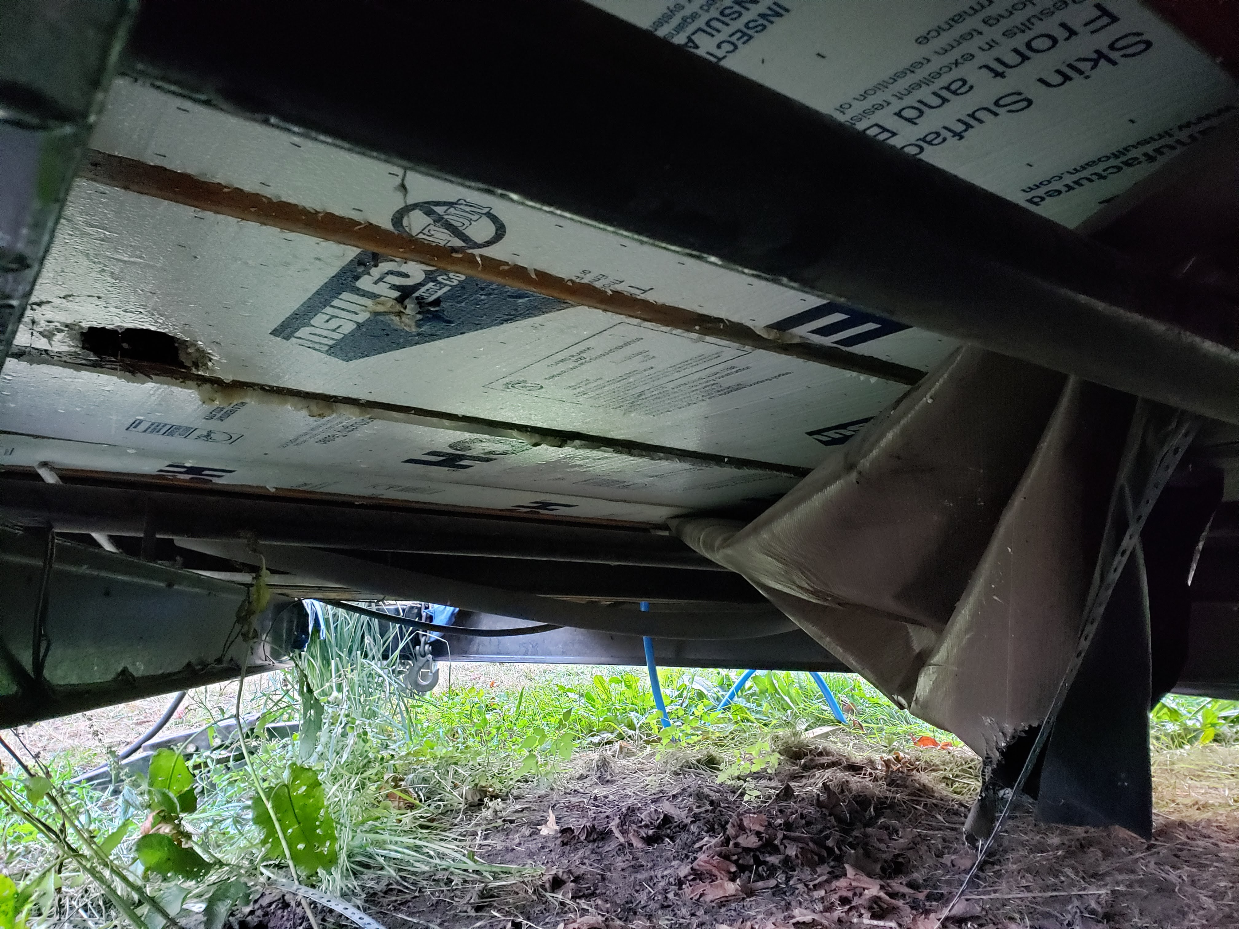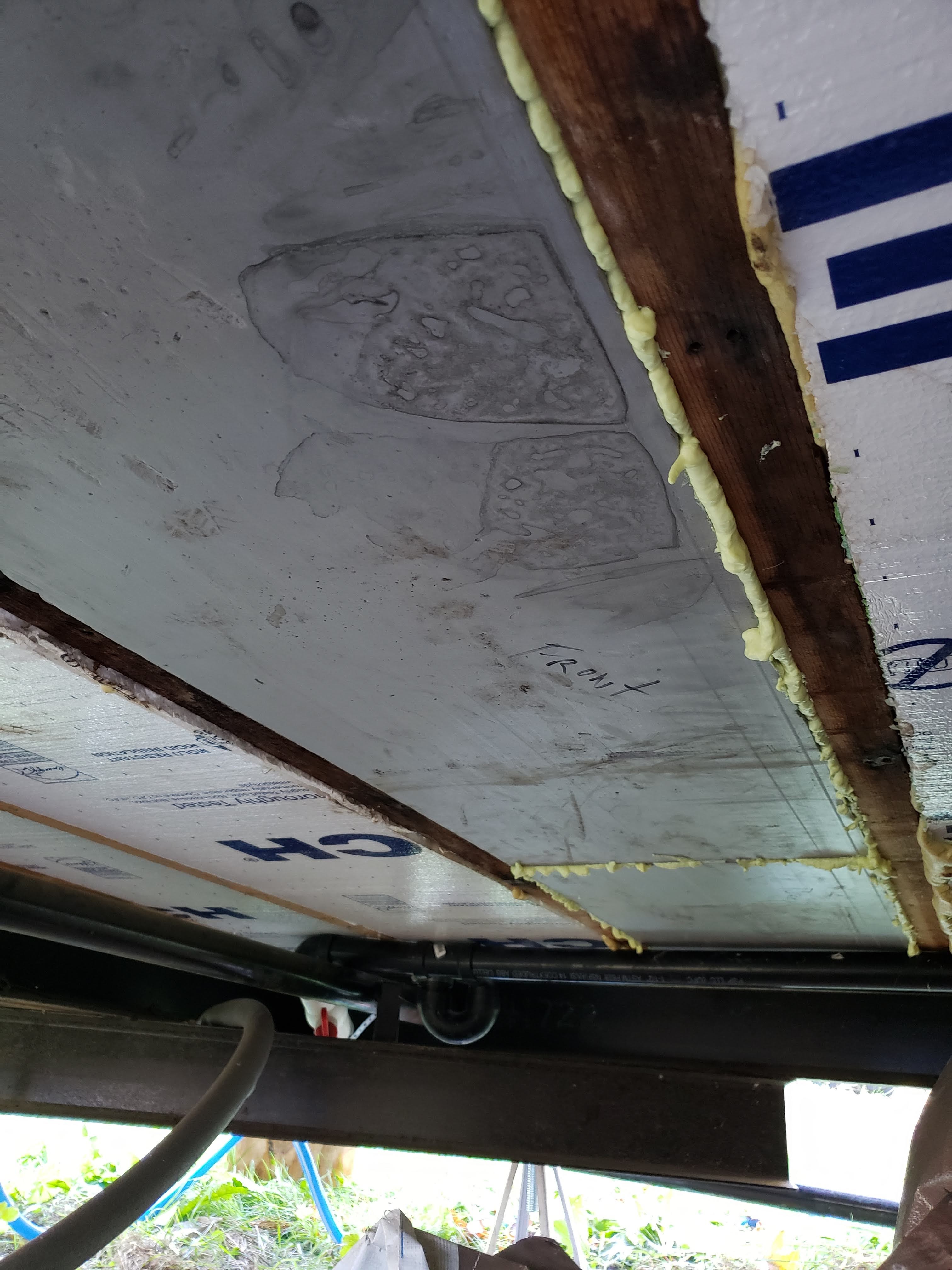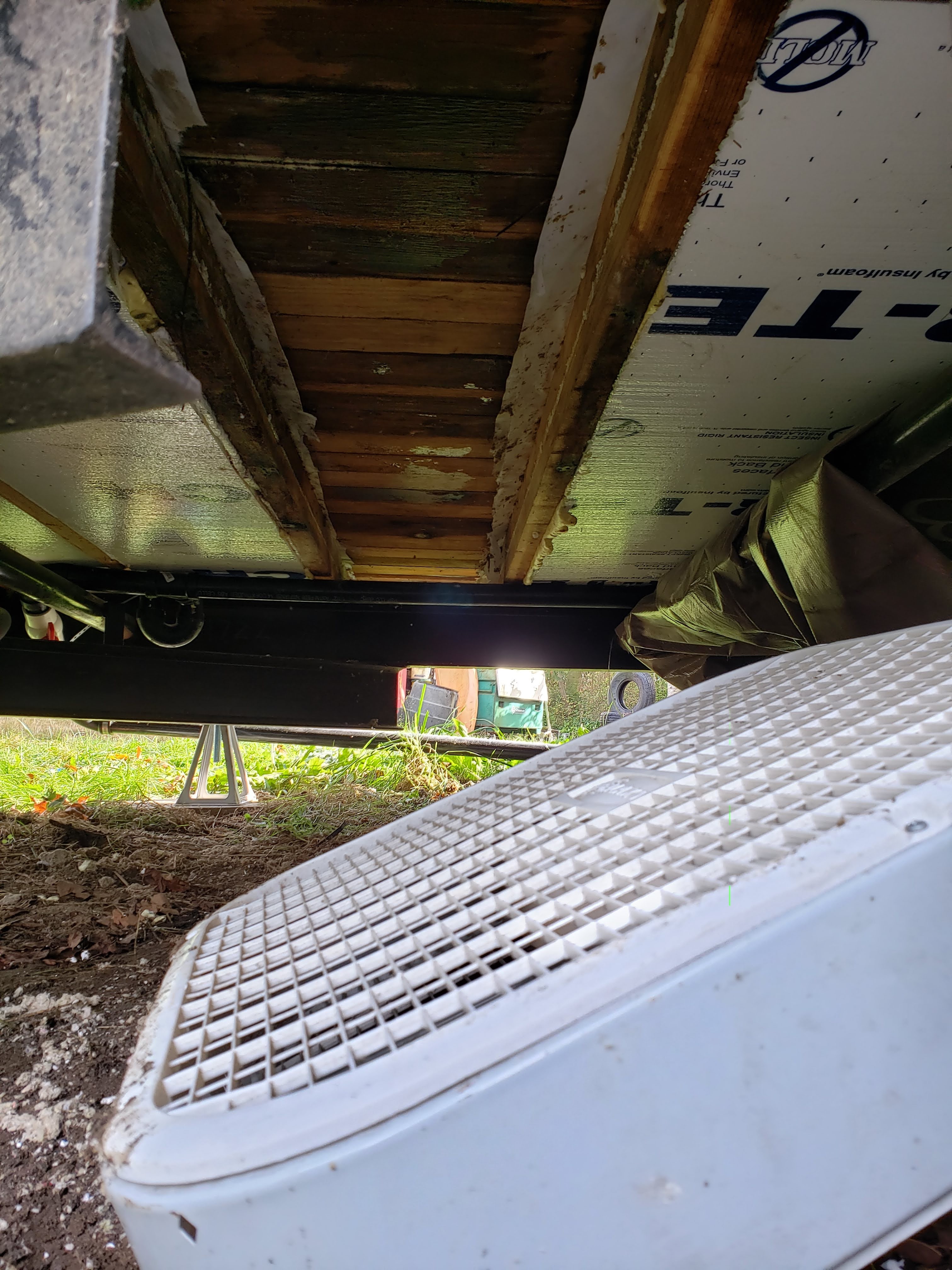 Turns out water is the enemy of wood houses…. Well houses in general. It’s not the water… It’s when the water is not neatly contained in the pipes, faucets and tanks where it is meant to be. My very funny brush with flooding the ark seemed only to be a surface issue, until I crawled under the house. That wonderful slippery formless thing called water is able to go everywhere. When I crawled under I was greeted by the waterproof barrier sagging with a full load of liquid like a big zit waiting to be popped. Oh Shit! This began my odyssey of taking down the barrier from half of the underbelly of the house… and ripping out wet insulation.